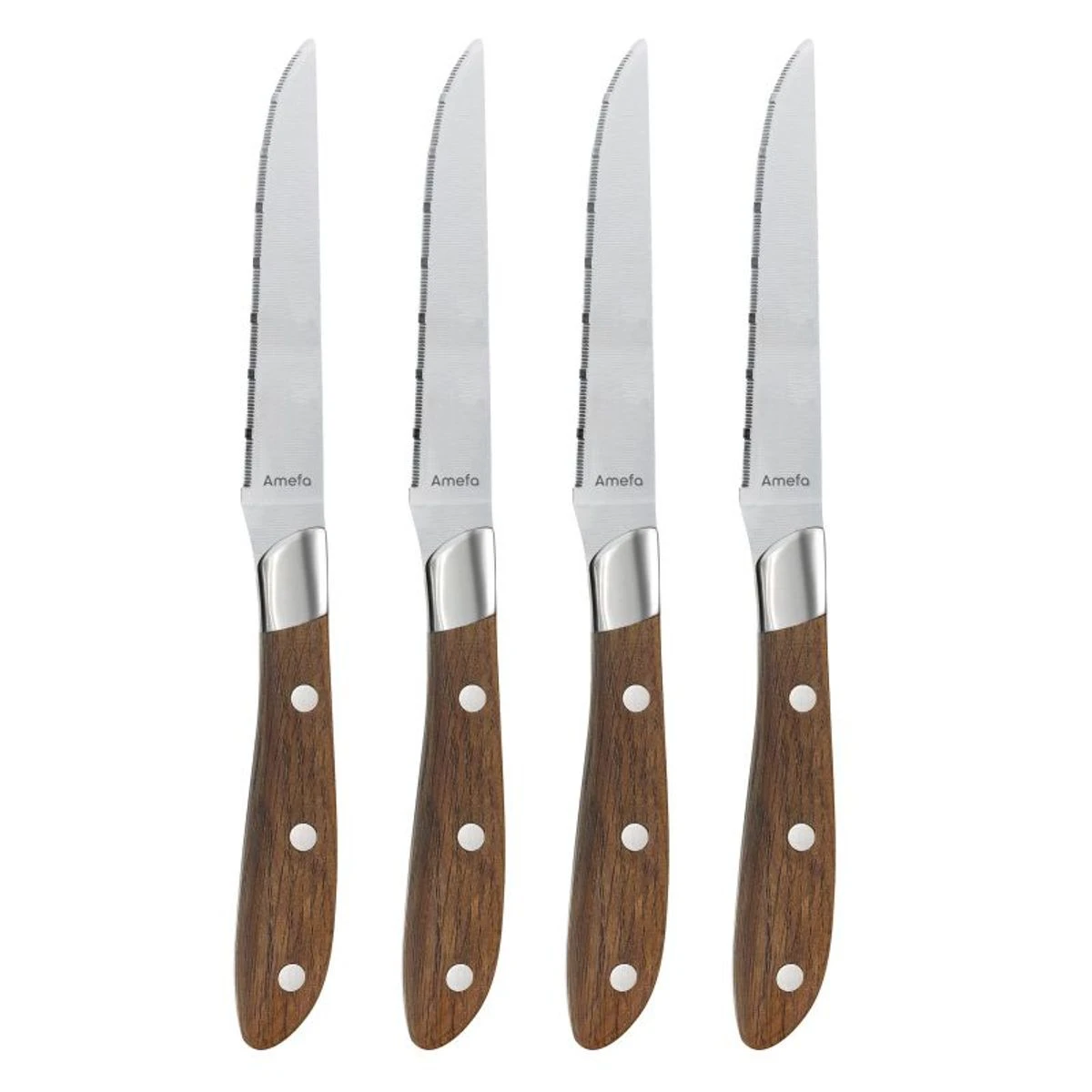 Lame en acier plein soie, crantée du côté coupant de la lame.