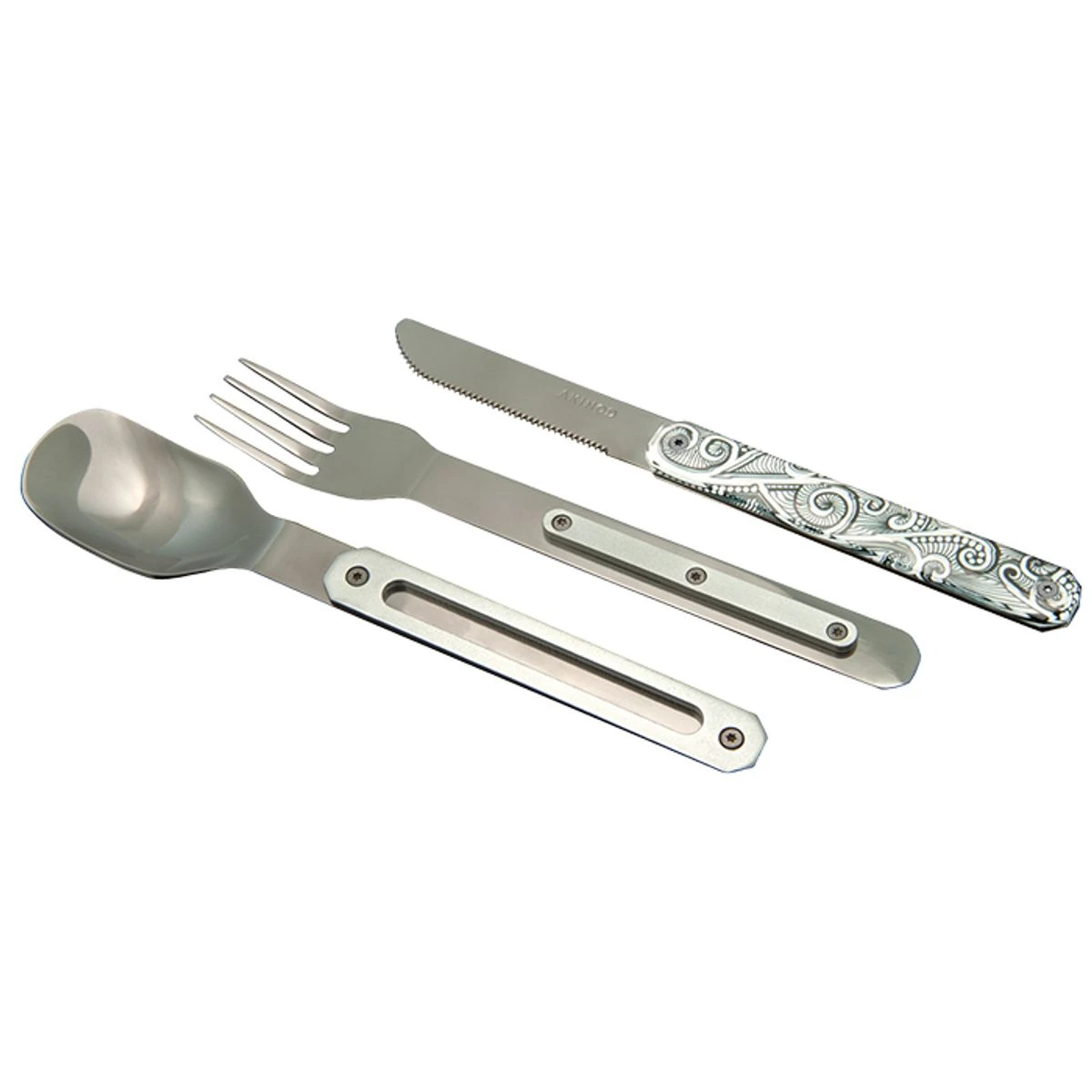 L’ensemble est composé d’une grande cuillère, d’une fourchette 4 dents et d’un couteau à lame micro dentée.