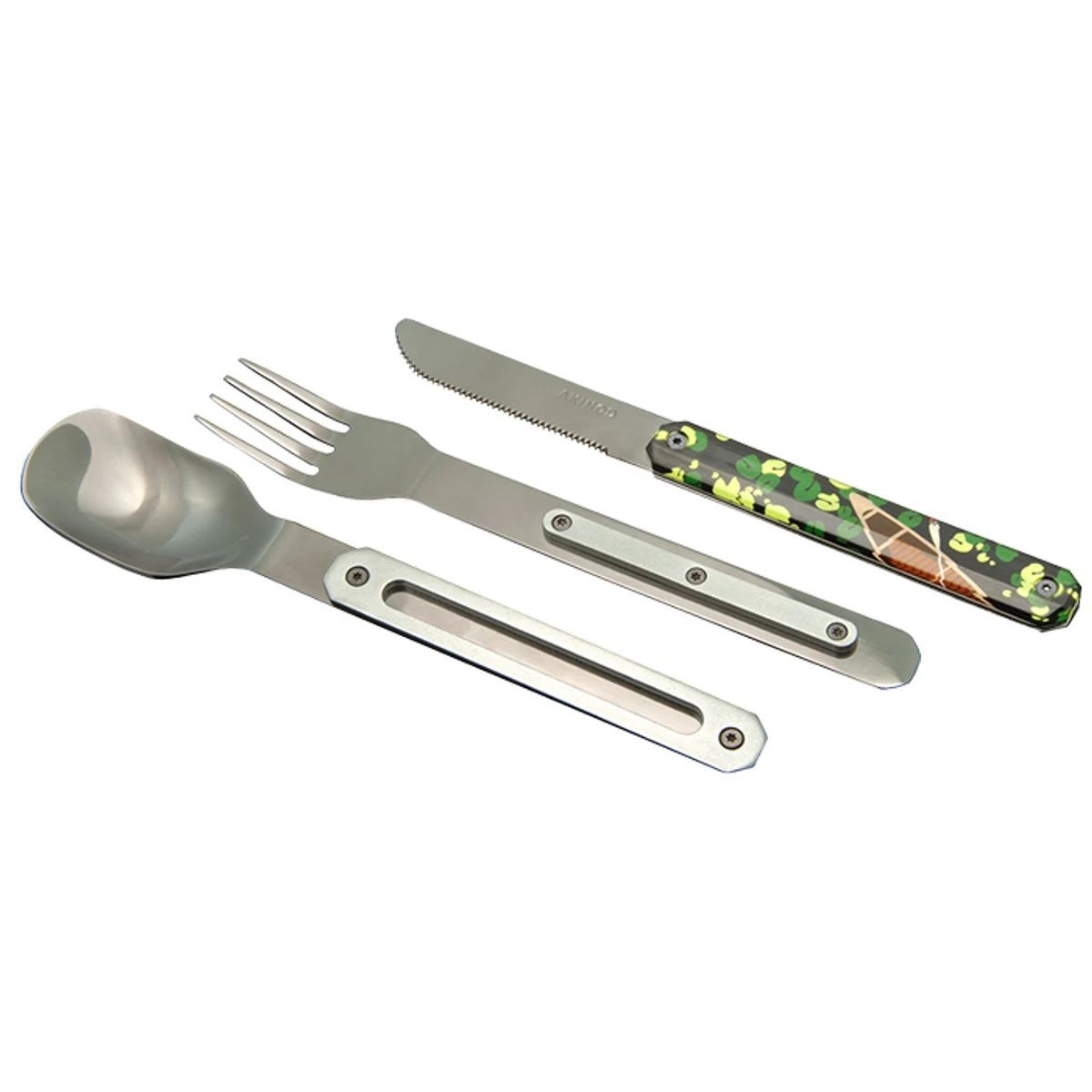 L’ensemble est composé d’une grande cuillère, d’une fourchette 4 dents et d’un couteau à lame micro dentée.