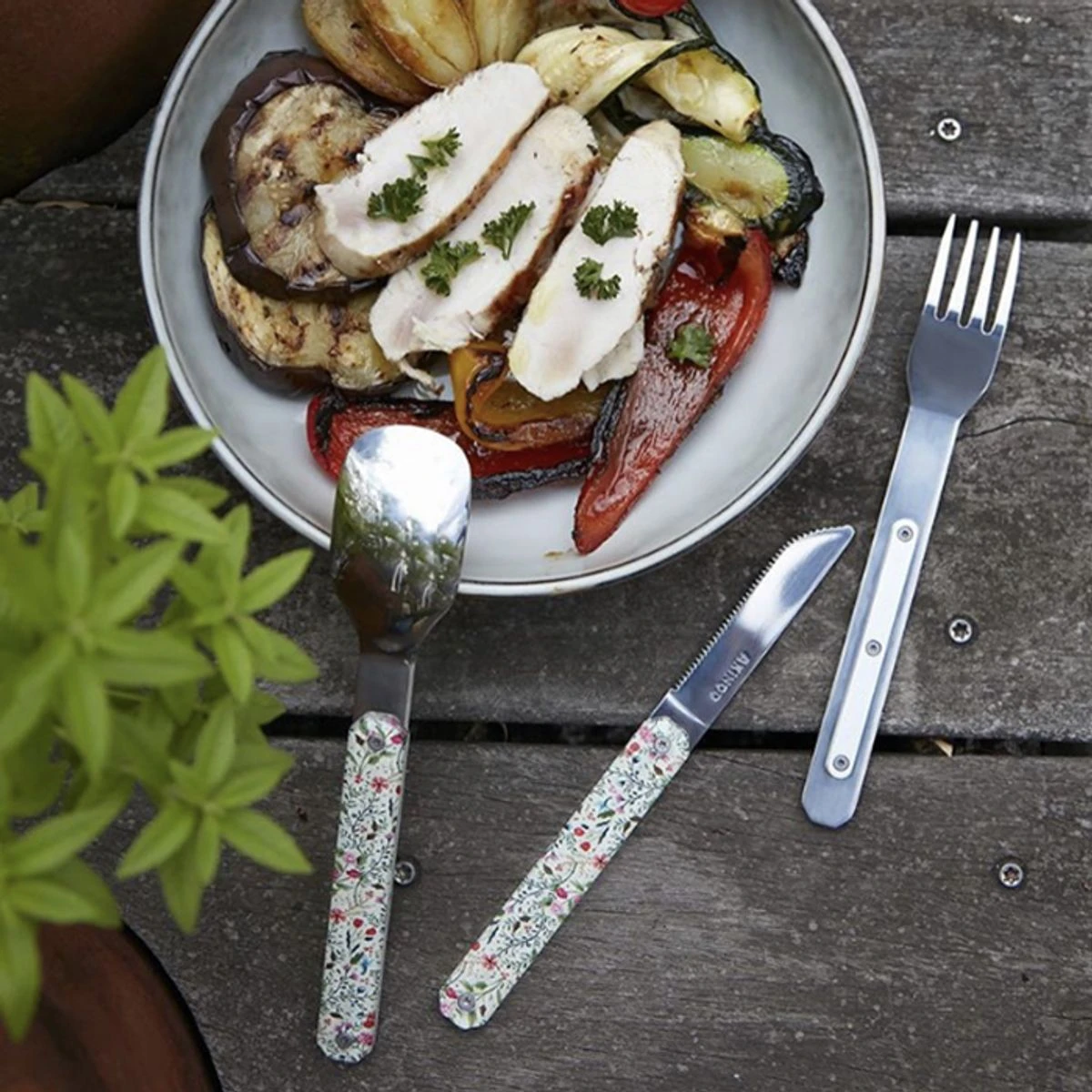 L’ensemble est composé d’une grande cuillère, d’une fourchette 4 dents et d’un couteau à lame micro dentée.