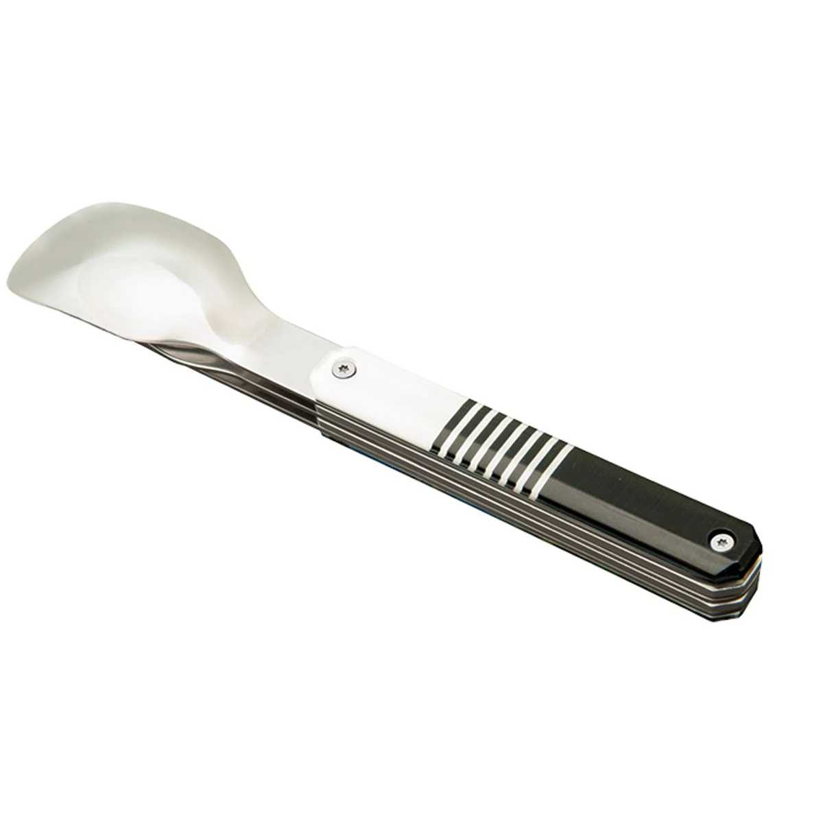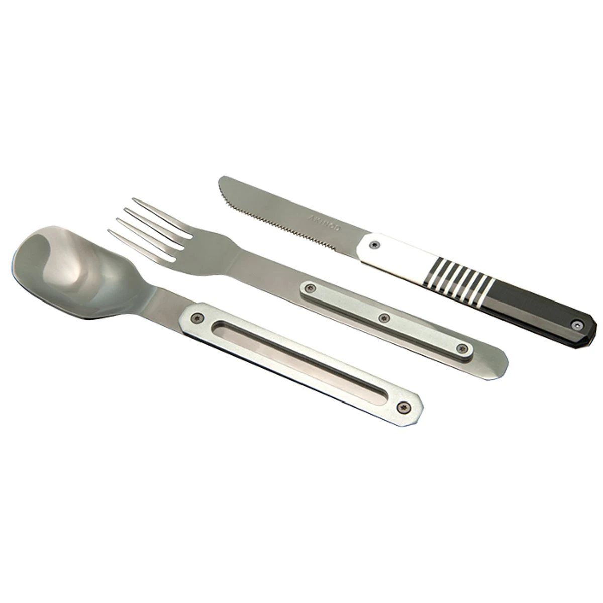 L’ensemble est composé d’une grande cuillère, d’une fourchette 4 dents et d’un couteau à lame micro dentée.