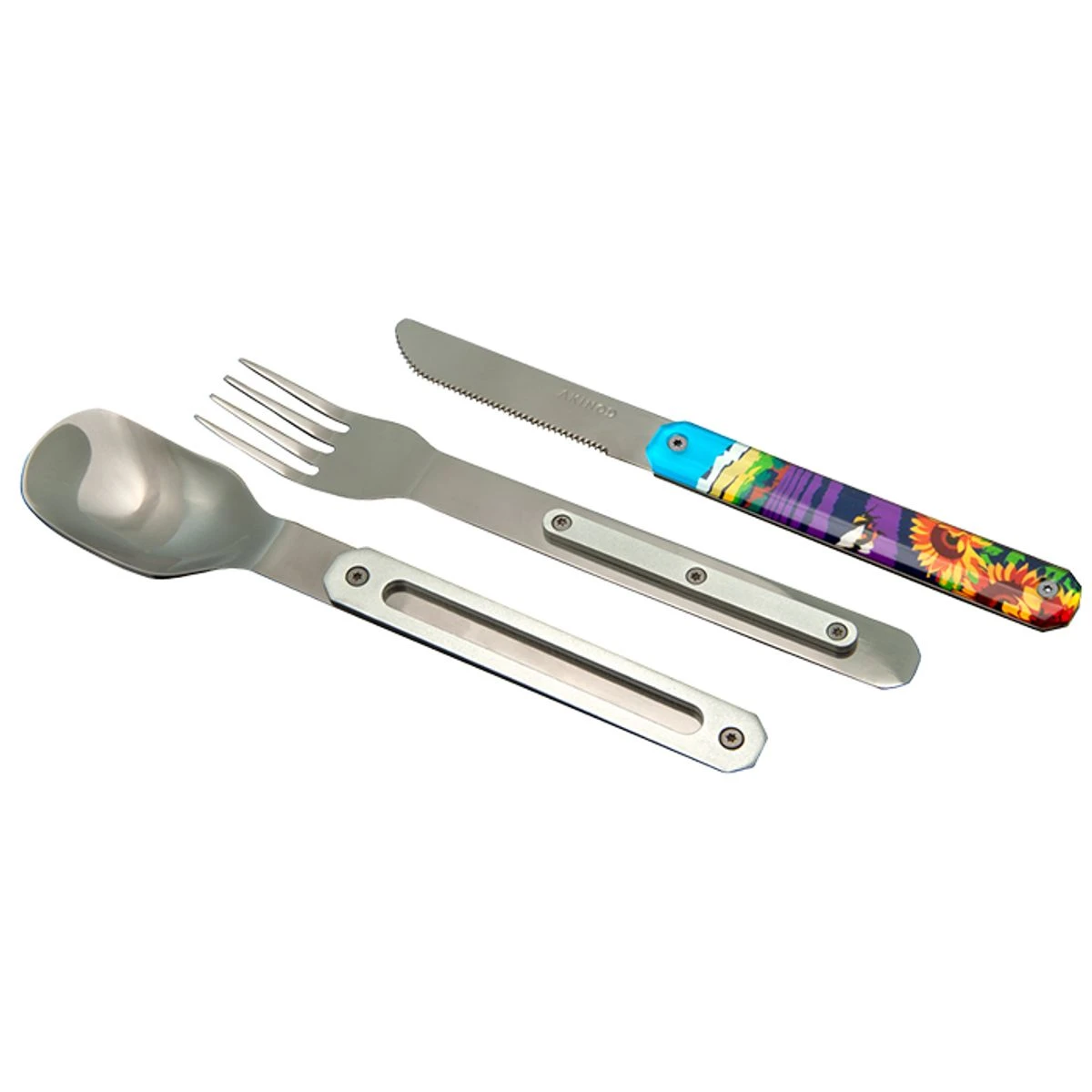 L’ensemble est composé d’une grande cuillère, d’une fourchette 4 dents et d’un couteau à lame micro dentée.