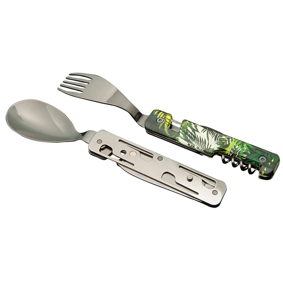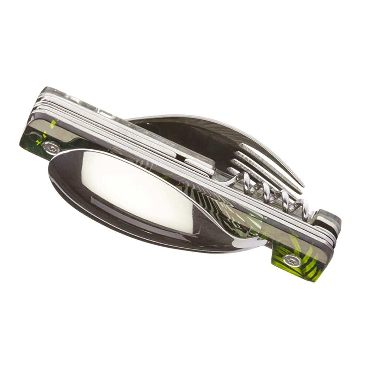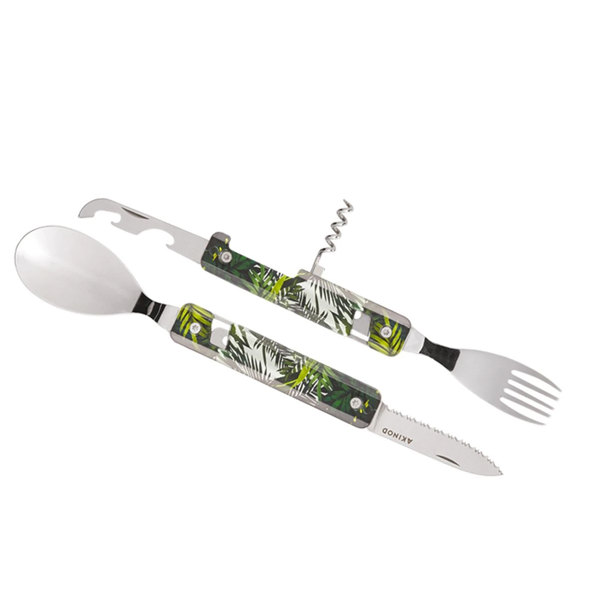 L’ensemble est composé d’une grande cuillère, d’une fourchette 4 dents, d’un couteau à lame micro dentée, d’un décapsuleur, d’un ouvre-boite et d’une tire-bouchon