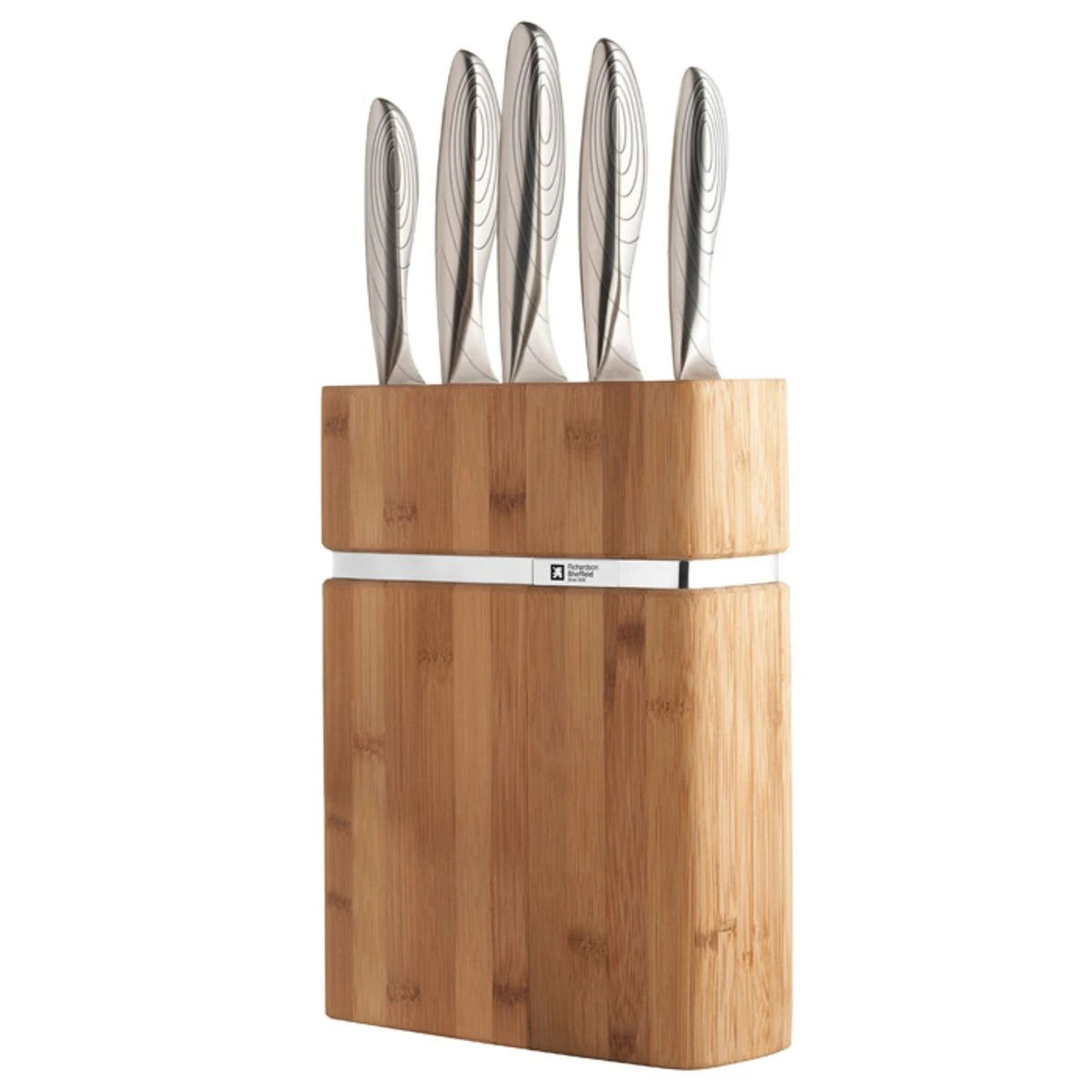 Ce bloc couteaux contient : 1 couteau d’office, 1 couteau utile, 1 couteau de chef lame 15cm, 1 couteau à découper, et 1 couteau à pain.