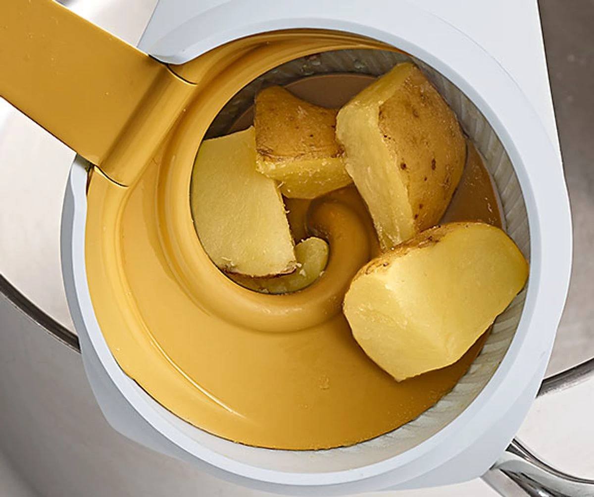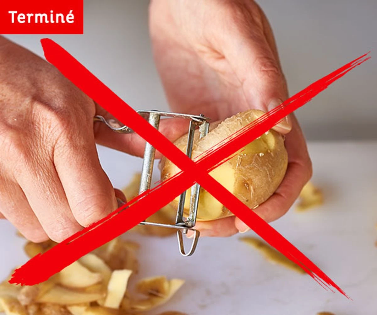 – Les pommes de terre seront épluchées pendant la réduction en purée.