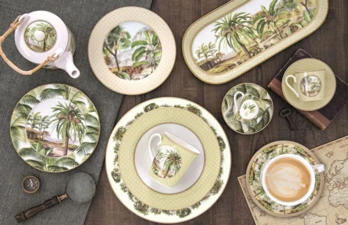 Cette collection est composée de tasses, théières, assiettes, plateaux de service, bols, plats…
