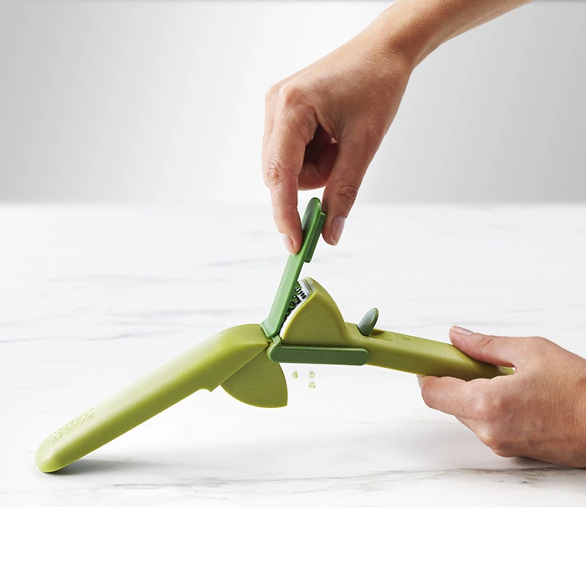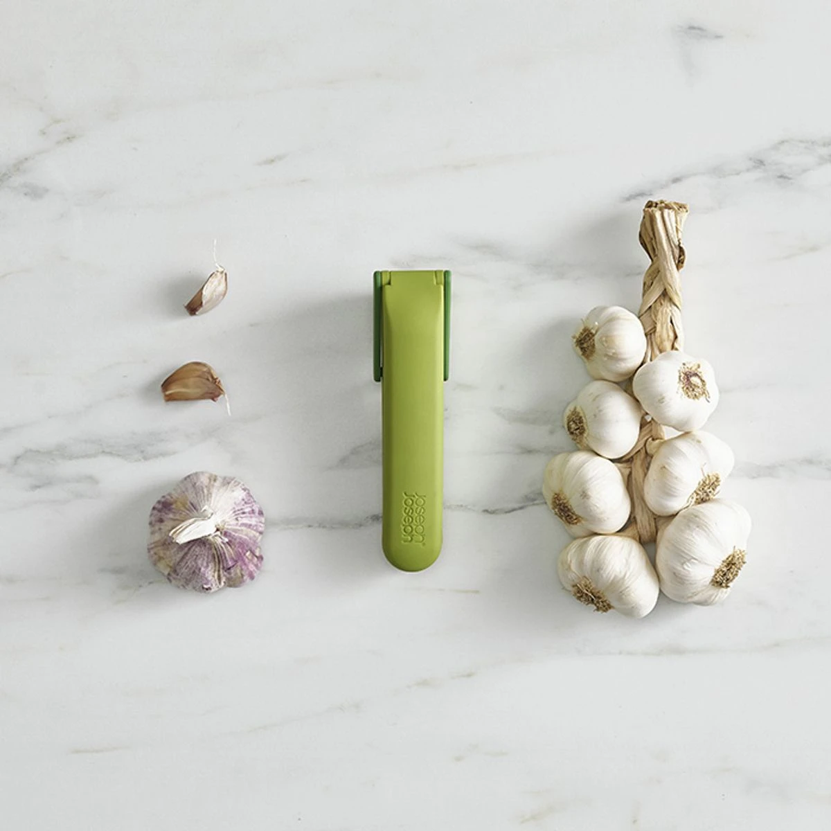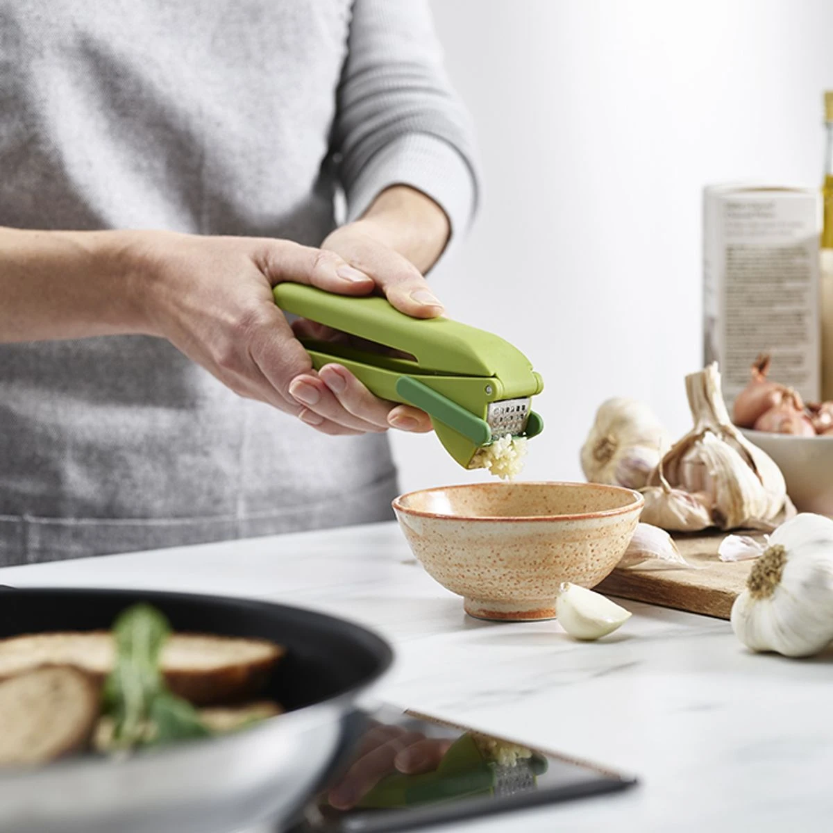 La lame d’essuyage actionnée par une gâchette élimine l’ail écrasé d’un seul geste sans interrompre votre préparation.