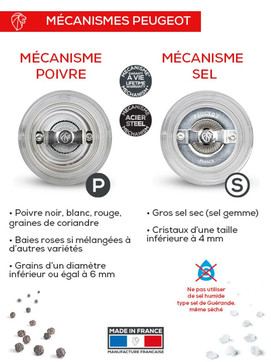 Le mécanisme est adapté aux poivres : noir, blanc, vert et aux baies roses si elles sont mélangées à l’un de ces 3 poivres (maxi 15 % de baies). Il convient également à la coriandre.