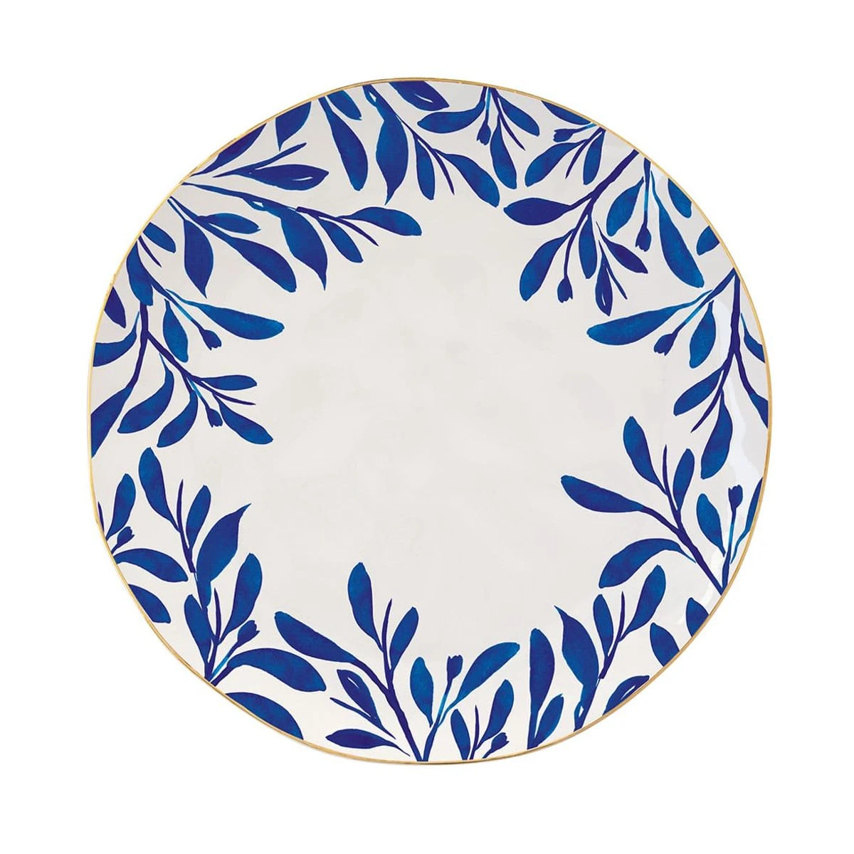 Assiette plate au motif de feuillage et à l’effet martelé, bordé d’un liseré doré sur le bord haut.