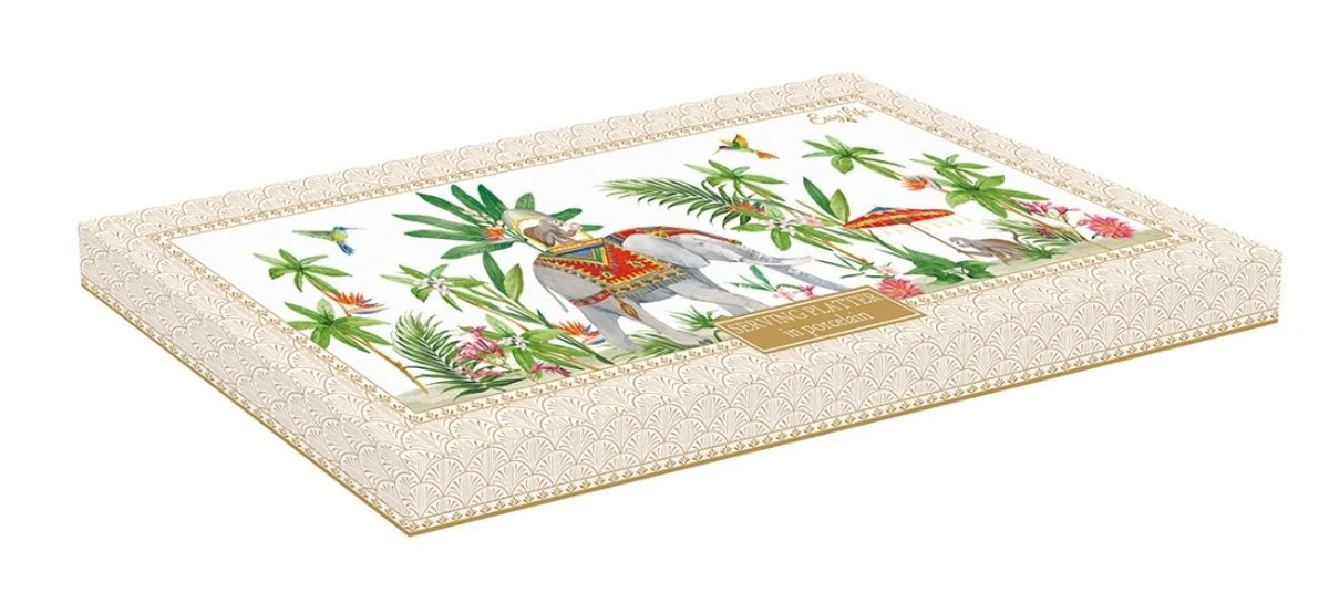 Tableau d’un éléphant, de singes et de colibris se baladant dans un jardin exotique,