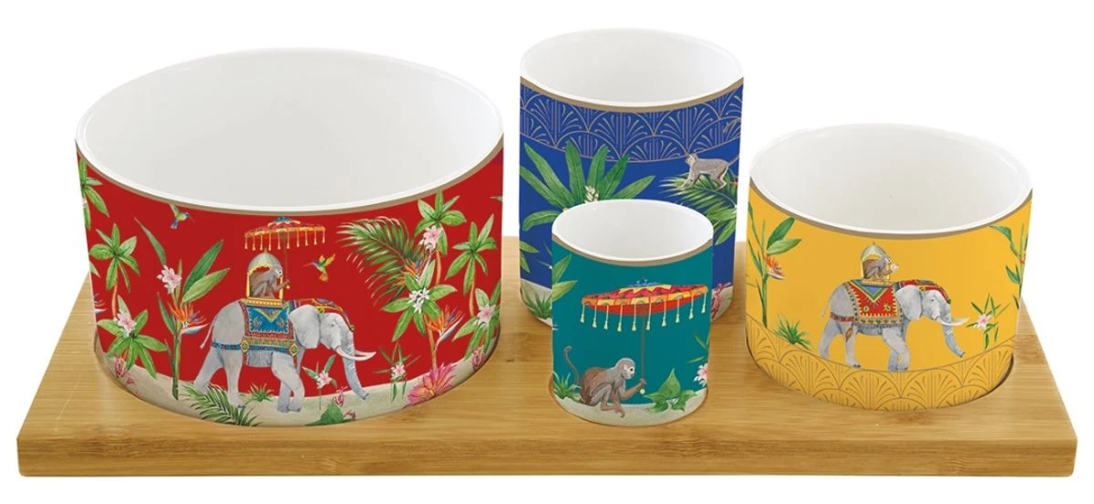 Pièces bordées de fins motifs dorés où des éléphants, des singes et des colibris se baladent à travers les fleurs et les plantes exotiques.