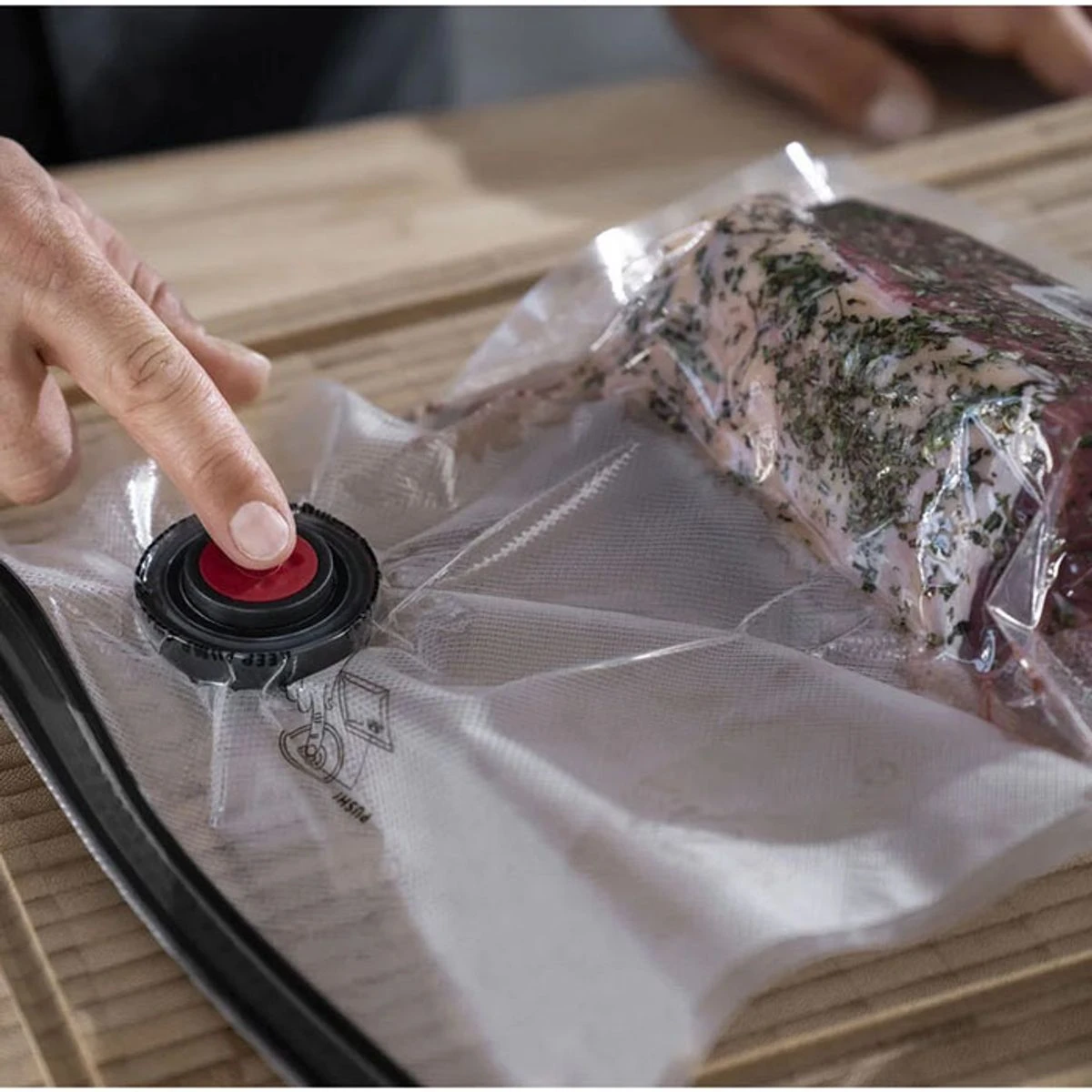 Il vous suffit d’appuyer sur le bouton au milieu de la valve en silicone rouge pour la verrouiller : les arômes et les vitamines sont préservés et les aliments gardent leur fraîcheur jusqu’à cinq fois plus longtemps !