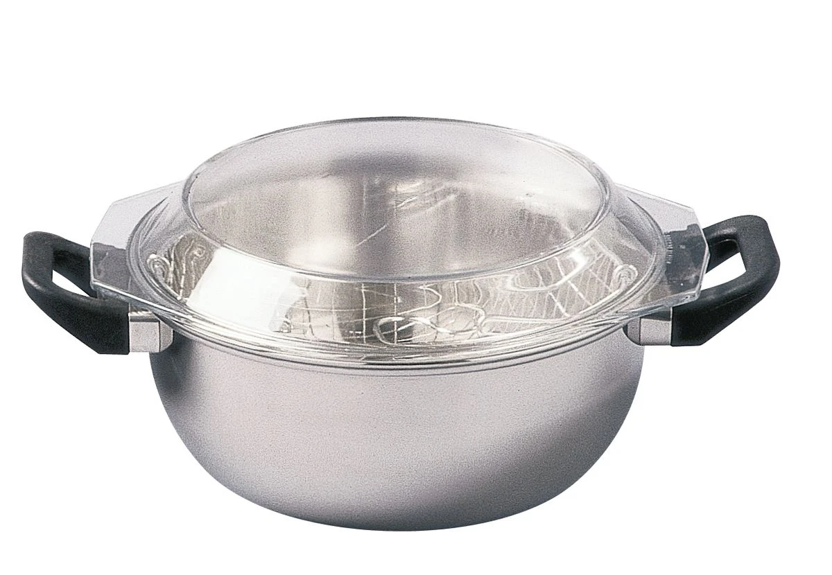 | Caractéristiques | Matériaux : Poignées en Bakélite Noire Couvercle : en verre Panier en fil d´acier étamé Tous feux & Induction |