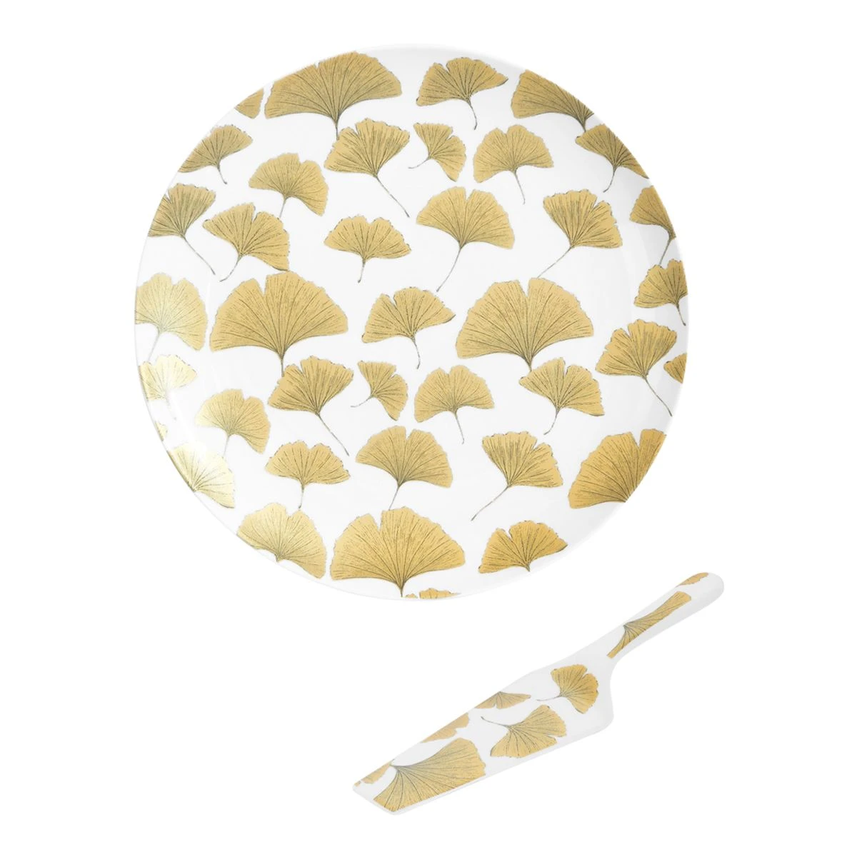 Plat de service rond avec sa pelle à tarte en porcelaine fine décorée.