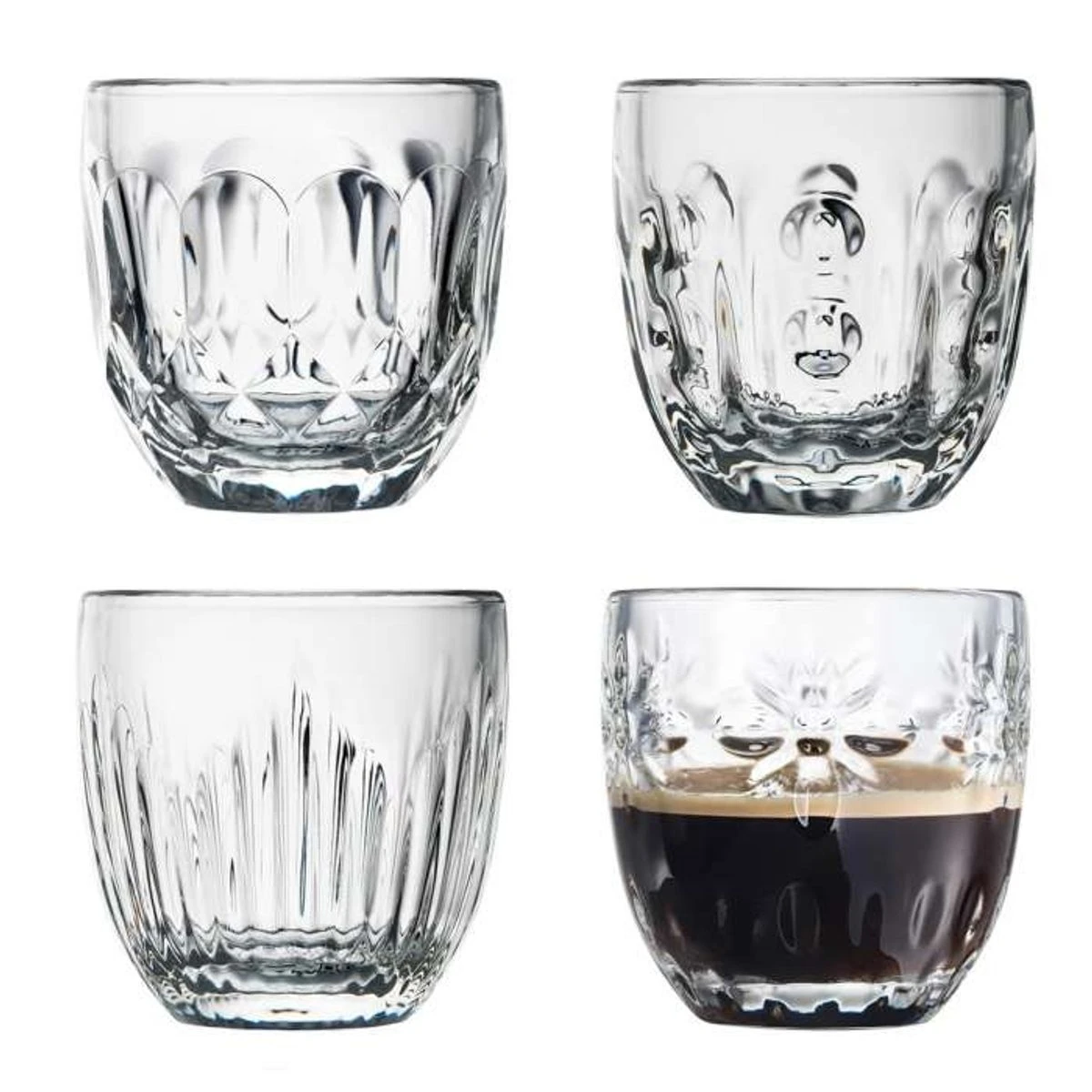 Coffret de 4 tasses en verre pressé avec 4 décors différents reprenant les motifs de taille de La Rochère :