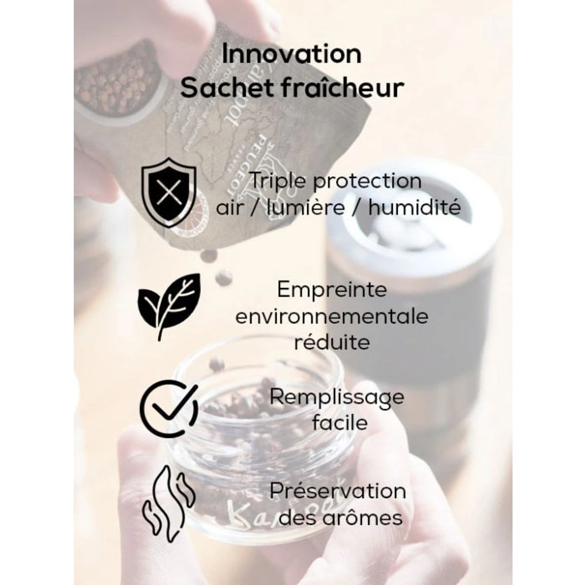 Pour un fonctionnement optimum du mécanisme, il est recommandé d’utiliser un poivre de diamètre inférieur ou égal à 6 mm