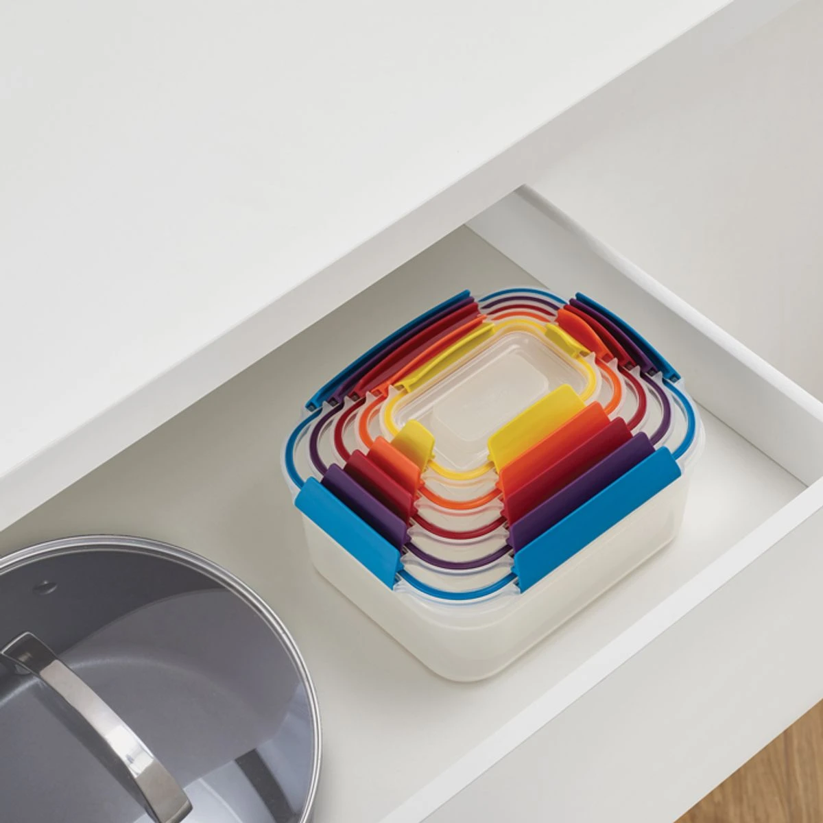 Les couvercles se rangent sur les boites et s’empilent aussi bien qu’elles.