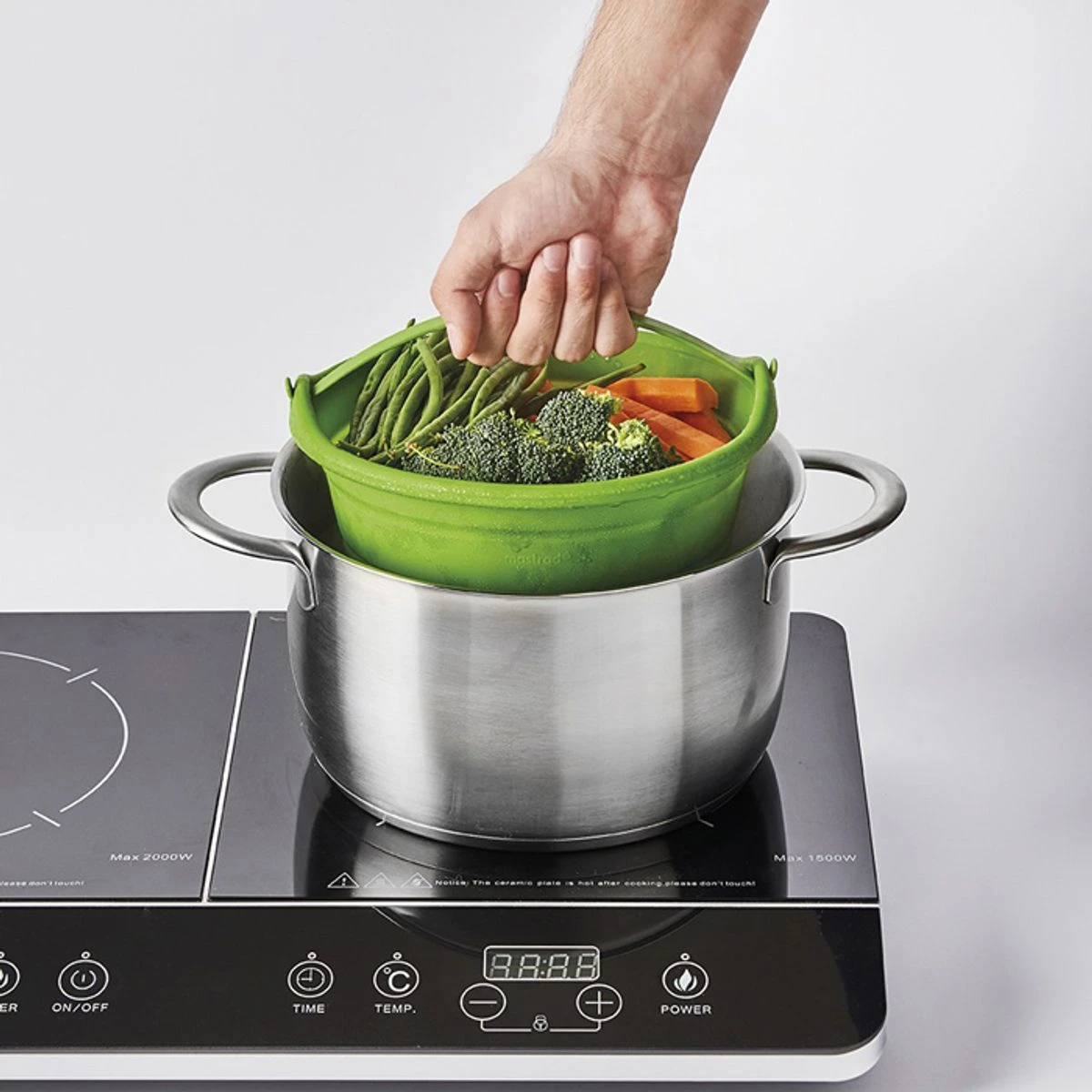 Double utilisation avec son anse, glissez-la dans une casserole de 24 cm minimum pour vous en servir en version panier vapeur.