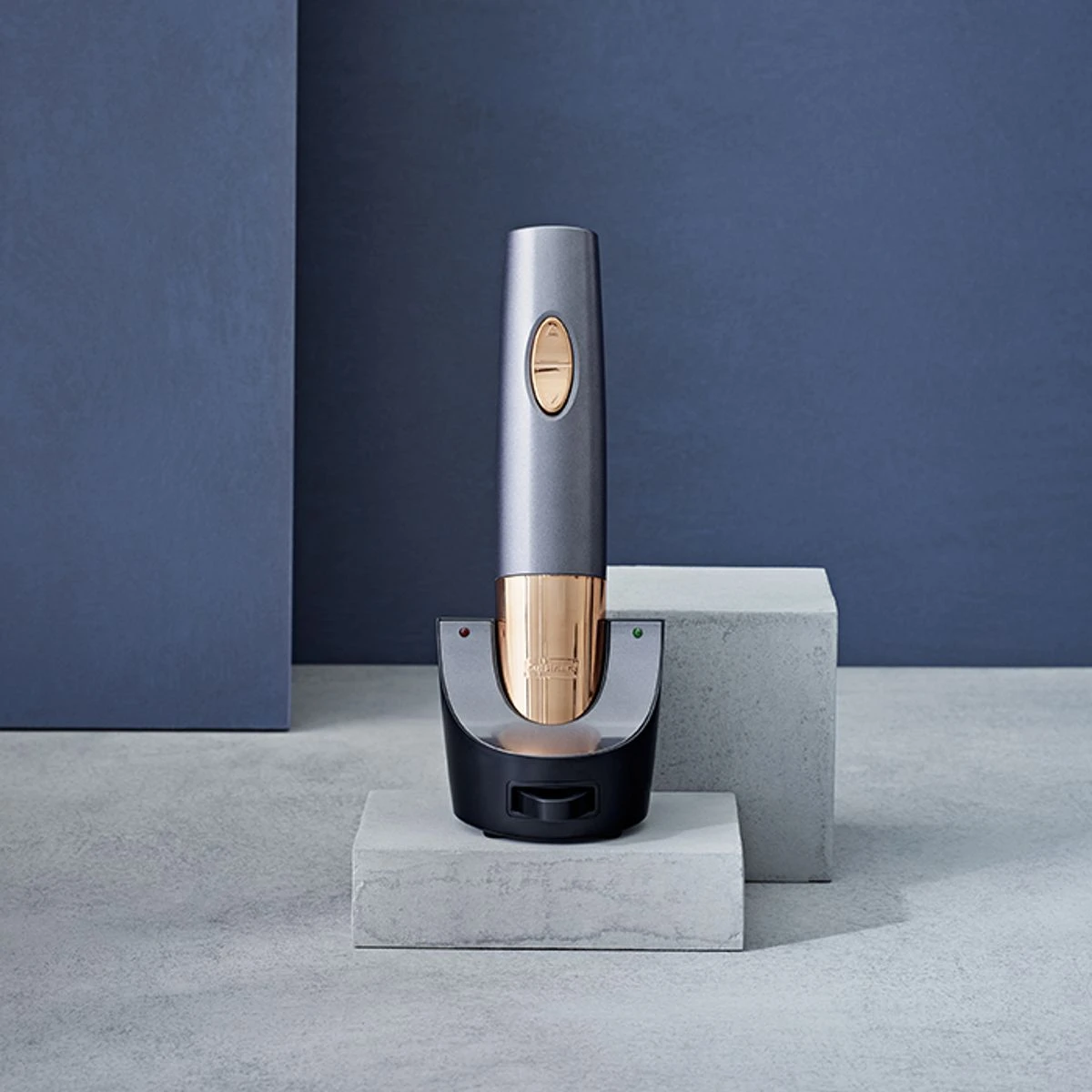 Utiliser le découpe-capsule, rangé dans la base pour couper la capsule métallique autour du goulot. Placer le tire-bouchon sur le goulot et appuyer en pressant la flèche pointant vers le bas pour déboucher la bouteille en quelques secondes. La vrille pénètre dans le bouchon, puis le retire progressivement de la bouteille. Lorsque le mécanisme s’arrête, le bouchon est complètement retiré de la bouteille