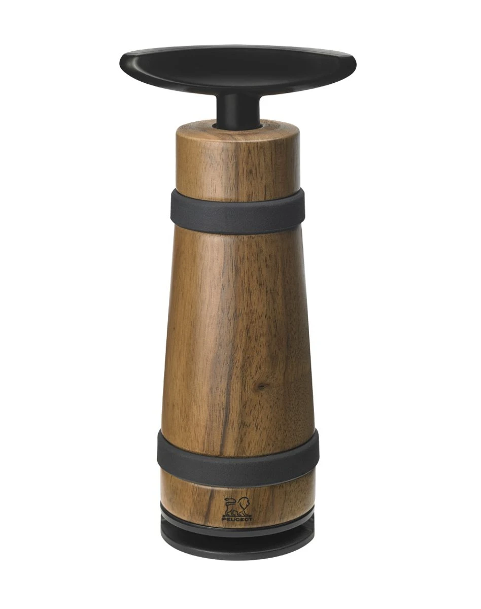 Cerclés d’anneaux noirs, Barrel, en bois de noyer PEFC™, évoque les tonneaux de vin aussi appelés barils.